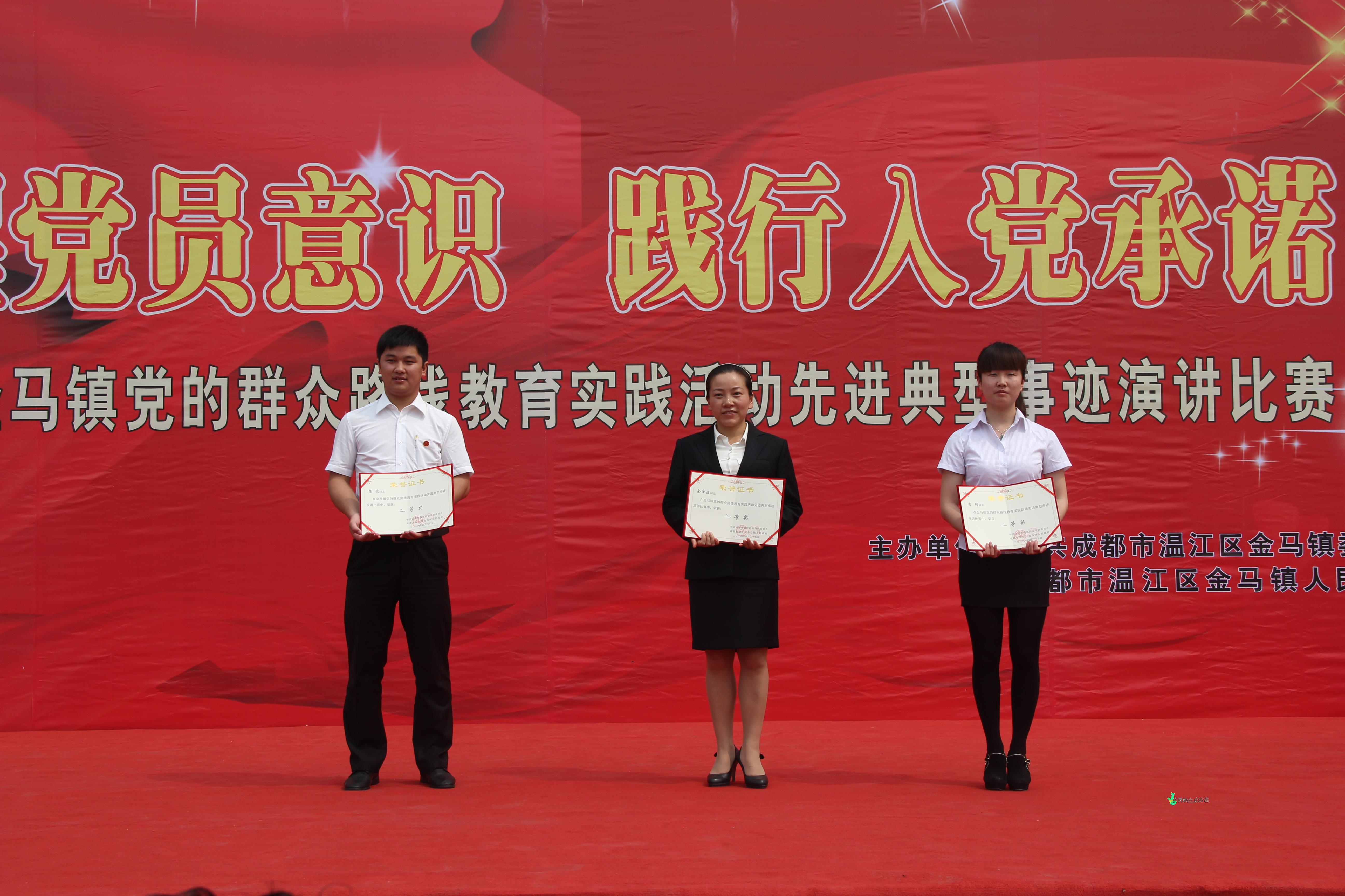 5月7日,金马学校曹静、余清波两位老师代表金马学校参加了金马镇党委、政府举办的“唤醒党员意识 践行入党承诺”党的群众路线教育实践活动先进典型事迹演讲比赛。曹静老师以真实感人的切身经历,从不同角度,不同的层面,深刻地阐述了金马学校徐贵平同志在教育战线如何践行党的群众路线,办人民满意教育。时而娓娓道来,时而慷慨陈词,时而风趣幽默、时而情真意切,以落落大方的举止、铿锵有力的语言,饱满真挚的情感,声情并茂地展示了教育工作者贴近群众、服务群众、奉献群众的精神风貌,博得了在场听众的阵阵掌声。最终以最高分力克群雄,摘得一等奖桂冠。余清波老师也获得二等奖。