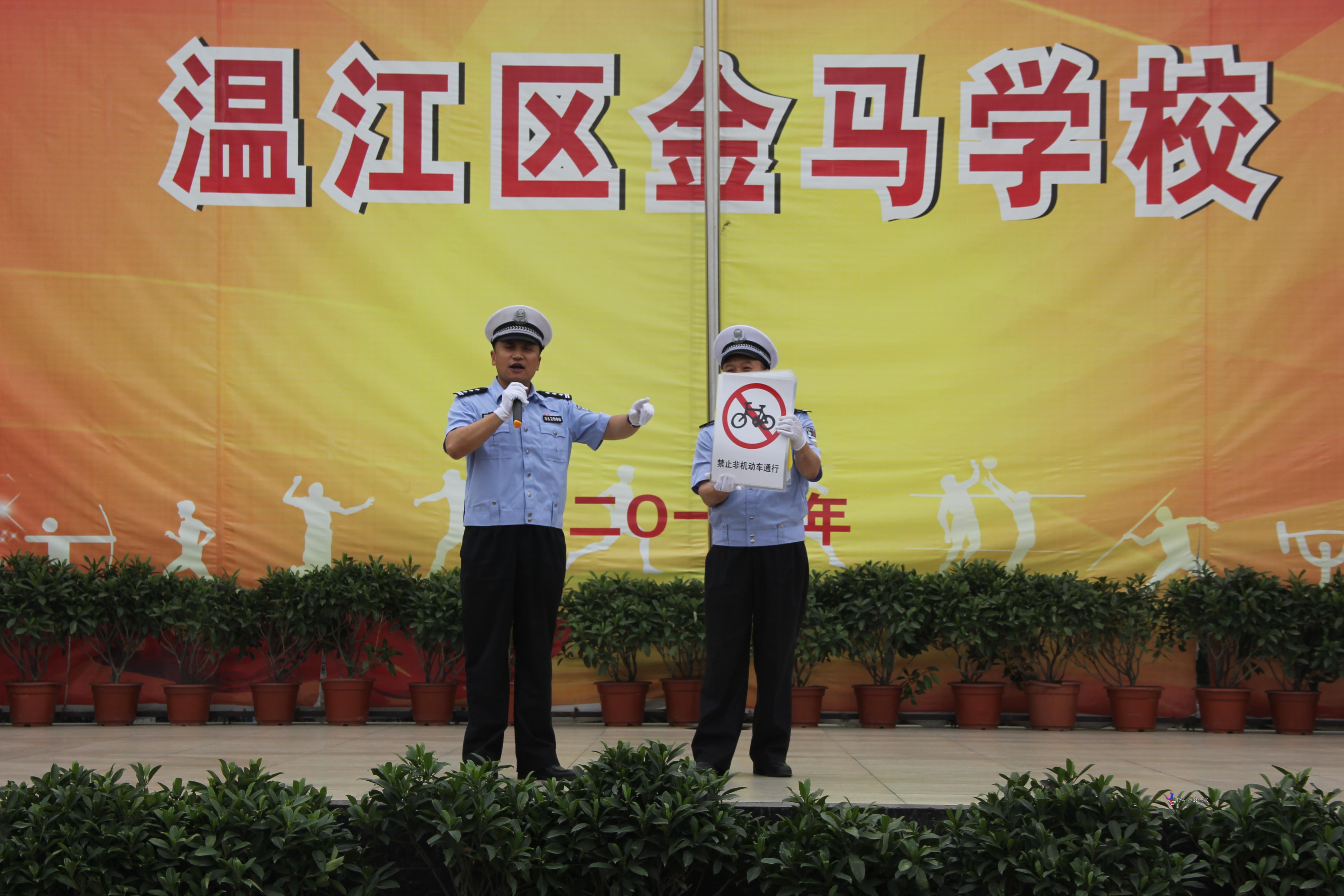 2014年5月22日,温江区交警大队刘队长一行送平安到金马学校,针对中小学生参与交通行为的方式和特点,通过宣传画、宣传手册等方式,从如何正确走路、行车、乘车,如何识别灯光信号、标志标线、如何增强预防道路交通事故的能力等方面,进行讲解交通安全法律法规和交通安全常识。内容通俗易懂,深入浅出的讲述了“平安出行”的重要性。全校同学认真倾听积极参与,力争做安全文明的交通出行者。