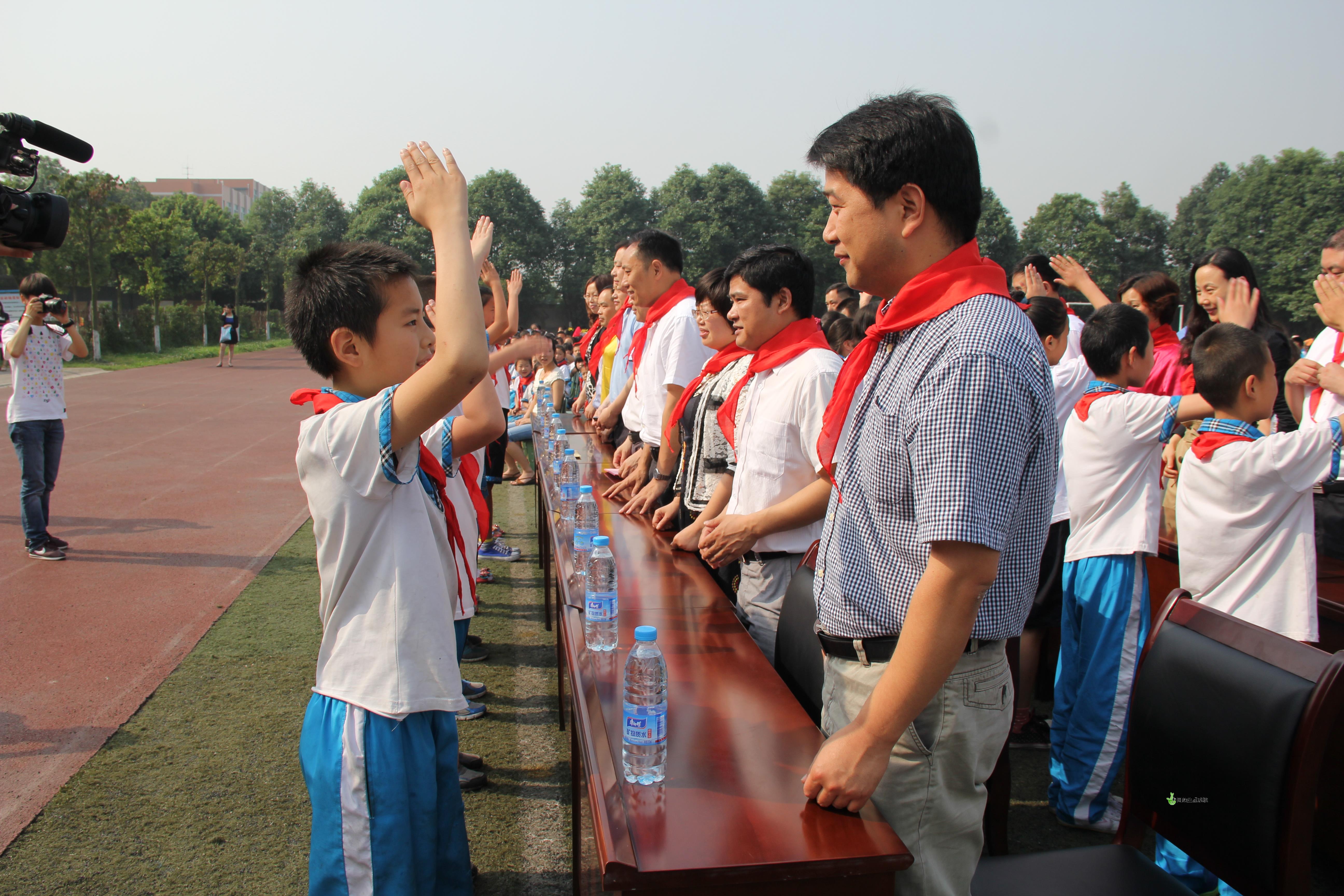 上午九点,庆祝活动准时拉开帷幕。全校师生首先迎来了温江区副区长赵一贵、区政协副主席廖松辉、区教育局副局长袁建云、金马镇党委书记李军、金马镇镇长魏德芹、金马镇副镇长王凤琼以及区各机关代表。少先队员代表为他们敬献了红领巾,他们对全体少年儿童送上了殷切关怀和真诚祝福。