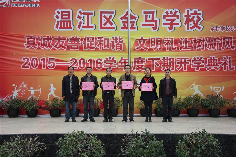 上周温江区教育局召开专门会议,对全区深入推进实施素质教育,全力提高教学质量的学校颁发奖证,表彰他们为“宜人温江、卓越教育”所作出的贡献。金马学校四、九年级均获得“绿化质量”一等奖,七、八年级均获得“绿色质量”二等奖,成为温江区调考年级全部获奖的唯一一所学校。