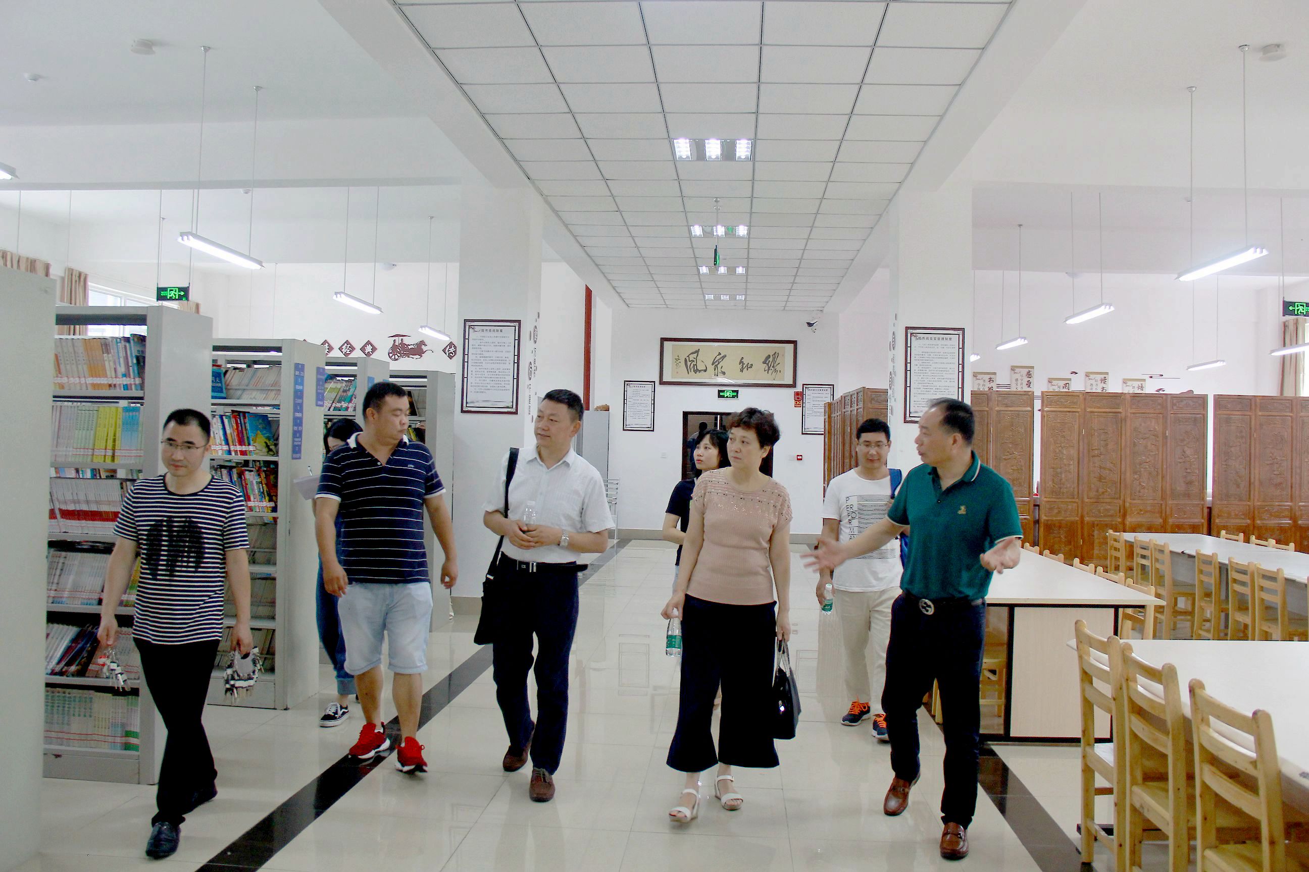 徐校长带领客人们参观学校图书室