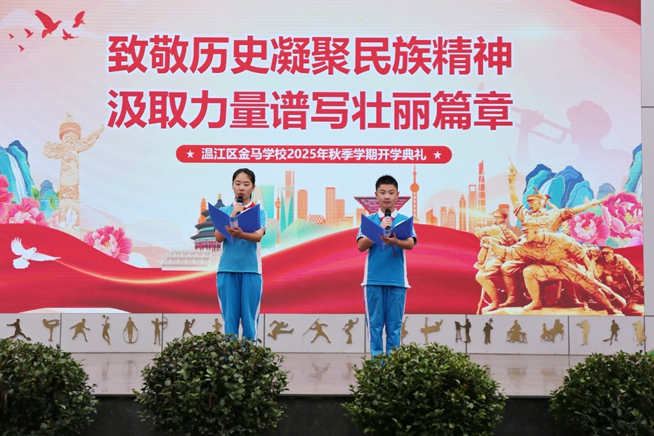 在这金风送爽,丹桂飘香的时节里,带着对暑假和盛夏的美好记忆,师生们又迎来了充满希望的新学期。9月1日,是2025-2026学年度秋季学期开学的第一天,温江区金马学校全校师生怀揣着对未来无限的憧憬,共同开启了“致敬历史凝聚民族精神,汲取力量谱写壮丽篇章” 秋季开学典礼。