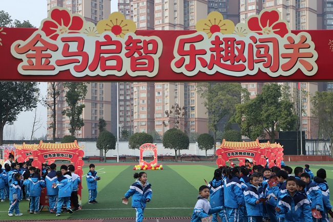 “万马奔腾读拼音”:老师们将拼音音节巧妙融入糖葫芦造型的道具中,一串串色彩鲜亮的“拼音糖葫芦”攫住了孩子们的目光,“马踏飞燕识字词”:学生随机抽取一张卡片,要准确认读词语,完成挑战即可获得小印章一枚。