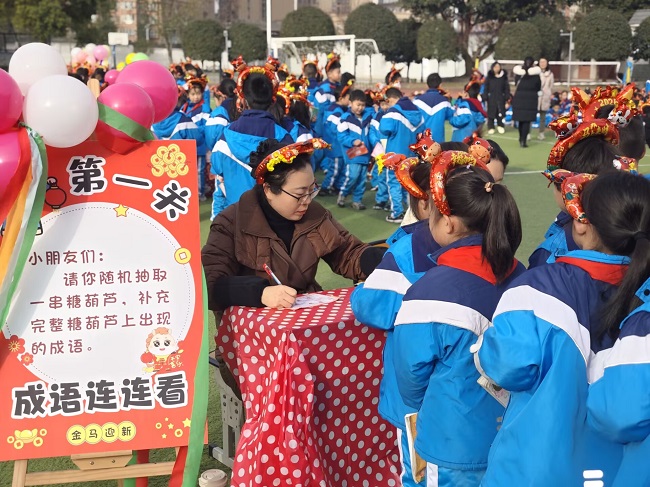 同时,老师们提前巧手布置场地,新年元素点缀其间,喜庆氛围拉满;各闯关环节巧思陈设,将知识融入趣味挑战,让无纸笔测试变身欢乐盛宴,尽显童真童趣。