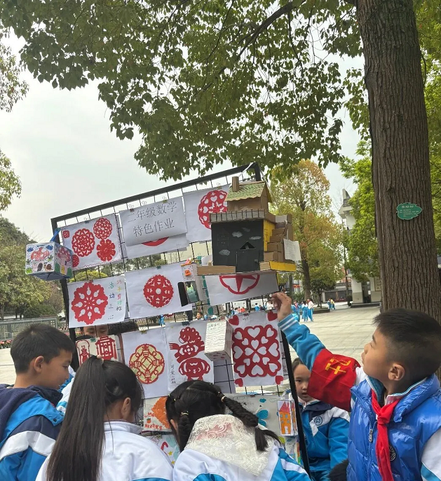 孩子们化身“小小剪纸家”,运用轴对称知识,在对折、裁剪中让彩纸变身精美窗花,直观理解“完全重合”的数学特征,感受数学与美学的独特韵味。
